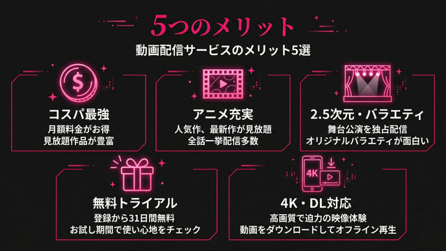 コストを抑えつつアニメをたっぷり楽しみたい方にとって、これ以上コスパの良いサービスは見当たらないでしょう。