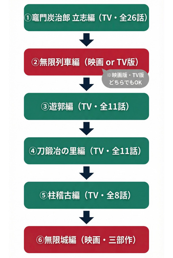 公開順(立志編→無限列車編→遊郭編→刀鍛冶の里編→柱稽古編→無限城編)で見るのがおすすめです。