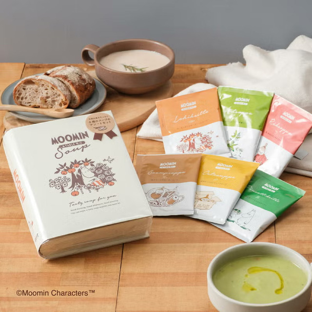 「ムーミン&テーブル 6種類のスープ ギフトボックス」は、北欧で親しまれている6種類のスープを詰め合わせたブック型のギフトボックス。本場のレシピをもとに、素材の旨味を活かした本格的な味わいで、お湯を注ぐだけで手軽に楽しめるため、忙しい方への贈りものにもぴったりだ。