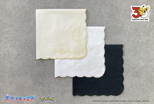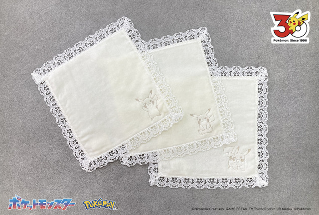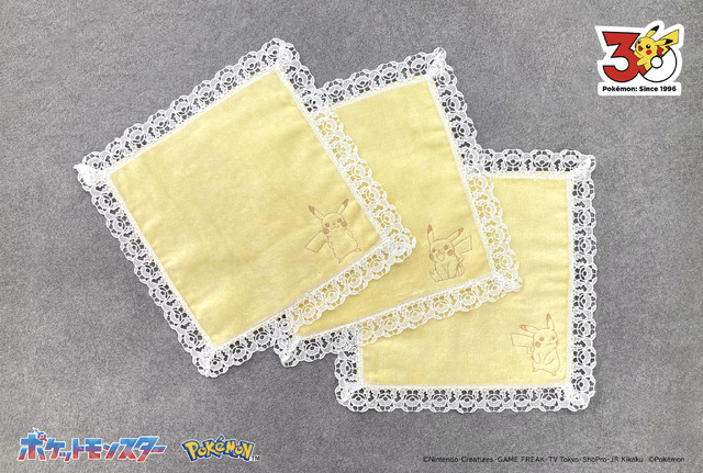 このたび、本作の人気キャラクター・ピカチュウがデザインされたハンカチが登場。商品は「レース付きタオルハンカチ」と「刺繍ハンカチ」の2パターンが展開。