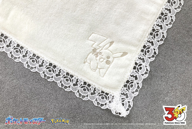 「レース付きタオルハンカチ」は、白いレースに、ピカチュウとモンスターボールをさりげなくデザインしたタオルハンカチ。タオル地には地色にやさしくなじむ色合いでピカチュウのワンポイント刺繍を施し、上品に仕上げられている。