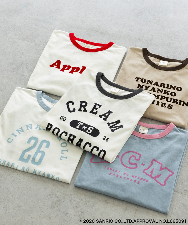 トレンド感のある「カレッジデザイン配色リンガーT」は、フロントに各キャラクターにちなんだカレッジロゴがプリントされ、背面にはロゴやキャラクターデザインがあしらわれた。ユニセックス仕様で、性別や年代を問わず着用できるゆとりのあるシルエットもポイントだ。