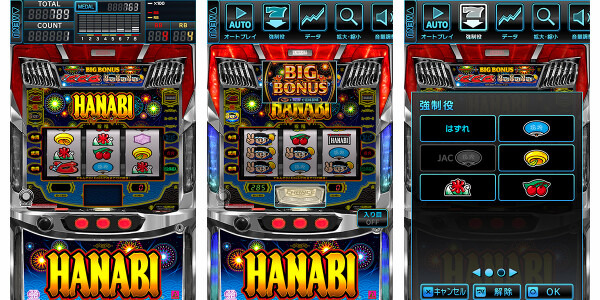 小役・ボーナスなどのフラグ設定ができる強制役や時短の高速オートモードなど、シミュレーターアプリならではの