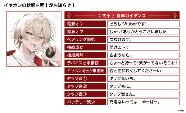 本モデルは、弐十の録り下ろし音声ガイダンス(全11ワード)を搭載。充電ケースの天面には弐十のロゴを、イヤホン本体には衣装タグのモチーフとイヤホンのために書き下ろしたサインをあしらい、パッケージには本モデルのために描き下ろされたイラストを採用しております。