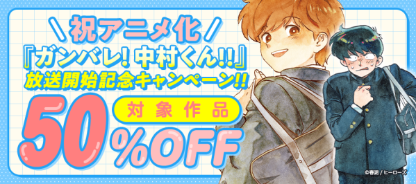 ・施策内容:『ガンバレ!中村くん!!』1巻半額 一部書店にて、1~2巻セット割1,100円(税抜)も実施