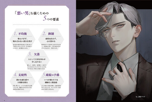また、「紳士」「裏社会」「闇落ち系」といったタイプ別の描き分けや、キャラクターの雰囲気を引き立てる光と影の演出など、「ワルい男」の魅力を最大限に引き出すテクニックを多数掲載。