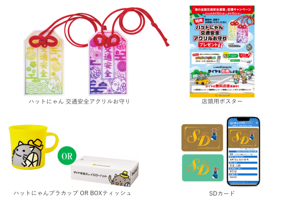 さらに、キャンペーン期間中、店頭で税込2,000円以上のお買物時に「SDカード(Safe Driverカード)」をご提示いただいた方には「ハットにゃんプラカップ」または「BOXティッシュ」をプレゼントいたします。