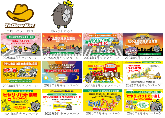 「全国交通安全運動応援キャンペーン」は、イエローハットが2019年から取り組んでいる社名に由来する「黄色い帽子」に交通事故防止の想いを込めた啓発活動です。毎年、「春の全国交通安全運動」と「秋の全国交通安全運動」の期間に合わせて、ドライバーの皆さまに交通安全の意識を高めてもらうことを目的にスタートいたしました。