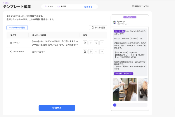 エルグラムのテンプレート機能は、あらかじめ作成したメッセージを保存し、自動応答やDM配信などさまざまな場面で呼び出せる機能です。