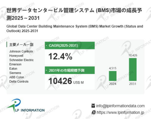 LP Informationの「世界データセンタービル管理システム (BMS)市場の成長予測2025~2031」(https://www.lpinformation.jp/reports/598419/data-center-building-maintenance-system--bms)によると、2025~2031年の予測期間中、データセンタービル管理システム(BMS)市場はCAGR12.4%で急速に成長し、2031年には104.3億米ドルに達すると予測されている。この成長は、クラウドサービスや大規模データセンターの拡大に伴い、エネルギー効率、設備稼働率、セキュリティ管理の高度化が求められていることに起因する。市場は地域別に均衡しており、北米やアジア太平洋地域を中心に高性能BMSの需要が継続的に増加する傾向がある。さらに、BMSは単なる設備管理ツールにとどまらず、エネルギーコスト削減、環境負荷低減、運用効率向上を同時に実現する統合管理プラットフォームとして位置付けられ、市場全体の成長を牽引する構造である。