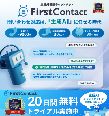 FirstContactではサポート付きで20日間の無料トライアルを実施しています。デモサイトや管理画面の操作、LINE/Facebook連携のお試しも可能です。導入に不安を抱えている方や、 まずはチャットボットがどんな風に使えるか試してみたい方など弊社の営業担当が サポートさせていただきますので 是非お気軽にお問い合わせください!