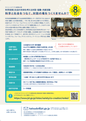 2026年度は、さらに多様なステークホルダーが対話・協働し、シンポジウム、フォーラム、サイエンスカフェ、ワークショップ等の双方向コミュニケーションを通じて社会実装につなげる企画を広く募集します。応募可能な機関・応募者は、日本国内の大学・研究機関およびその機関に所属する研究者やURA等です。初めての方の積極的なご応募もお待ちしております。