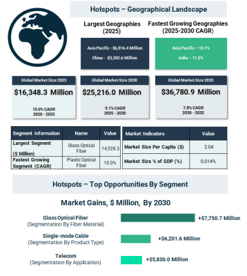 光ファイバーケーブル市場における成長機会は、ガラス光ファイバーおよびシングルモードケーブル分野に集中している。通信分野が引き続き需要の中心であり、中国はインフラ整備の進展により市場拡大を牽引すると見込まれている。