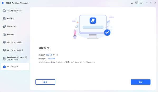 4.データの消去には時間がかかりますので、しばらくお待ちください。ディスクの損傷を防ぐため、ディスクの抜き取りやプログラムの終了は避けてください。データの消去が成功したら、「完了」ボタンをクリックしてください。