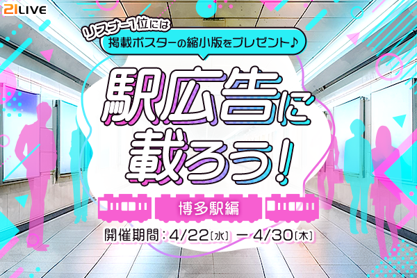 本イベントでは、配信中に獲得したギフト数に応じてランキングを決定し、総合ランキング入賞者には博多駅のポスター広告に掲載されるモデル掲載権をプレゼントします。