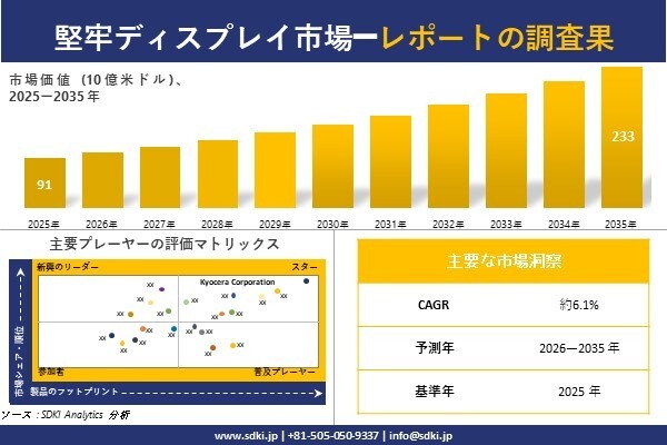 堅牢ディスプレイ市場に関する当社の調査レポートによると、堅牢ディスプレイ市場規模は 2035 年に約 233 億米ドルに達すると予想されています。さらに、2025 年の 堅牢ディスプレイ市場規模は約 91 億米ドルとなっています。堅牢ディスプレイに関する市場調査レポートでは、市場は 2026-2035 年の予測期間中に約 6.1% の CAGR で成長するとも述べられています。