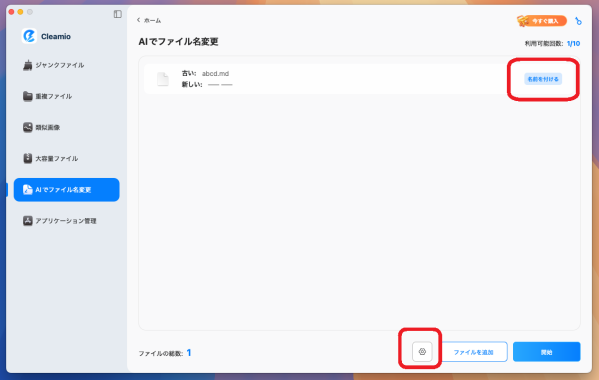 1. Cleamioを起動し、左サイドバーから「AIでファイル名変更」>「開始」をクリック。