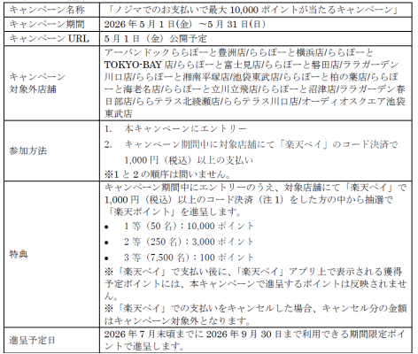 本導入を記念して、2026年5月1日(金)から5月31日(日)まで、「ノジマでのお支払いで最大10,000ポイントが当たるキャンペーン」を実施します。本キャンペーンでは、キャンペーン期間中に対象店舗(注3)にて「楽天ペイ」で1,000円(税込)以上の支払いをした方の中から、抽選で50名に「楽天ポイント」10,000ポイント、250名に「楽天ポイント」3,000ポイント、7,500名に「楽天ポイント」100ポイントを進呈(注4)します。