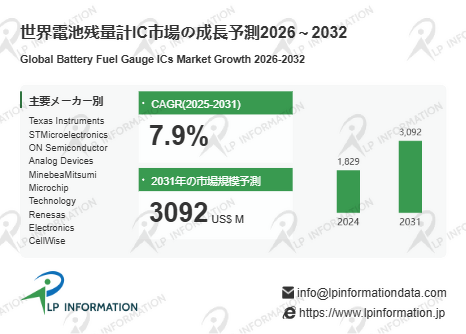 LP Information調査チームの最新レポート「世界電池残量計IC市場の成長予測2026~2032」(https://www.lpinformation.jp/reports/583431/battery-fuel-gauge-ics)によると、グローバル電池残量計IC市場は2025~2031年に年平均成長率7.9%で拡大し、2031年に30.92億米ドルへ達すると予測されている。安定成長の背景には、民生機器の成熟市場に加え、産業・電動モビリティ・ヘルスケアといった高付加価値領域での実装拡大がある。特に、長寿命化と高エネルギー密度化が進むバッテリー技術に対応するため、残量計ICのアルゴリズムや計測精度への投資が増加し、単価の底上げも進んでいる。市場の裾野は地域的にも広がり、新興国におけるIoTデバイス普及が中長期的な需要をさらに押し上げる構造が形成されつつある。