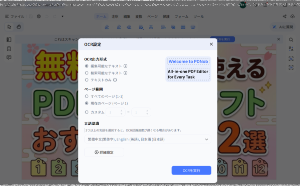 ・OCR機能搭載:スキャンPDFも編集可能なテキストに変換(多言語対応)