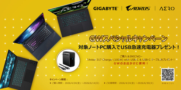 本キャンペーンは、キャンペーン期間中に対象ノートPC製品を購入し、GIGABYTEの公式SNSアカウント(InstagramもしくはX)をフォローしていただいたユーザーに、もれなく「Anker 317 Charger (100W) with USB-C & USB-C ケーブル」をプレゼントするというものです。対象ノートPC製品は、以下のとおりです。