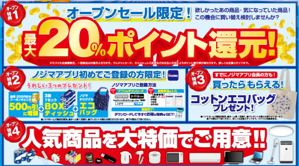 また、4月24日(金)~5月15日(金)の期間中、オープン限定特価としてノジマポイントが最大20%還元になるお得なセールも開催いたします。皆さまのご来店をお待ちしております!