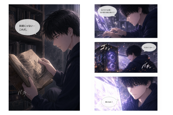 漫画制作では、美しいイラストを生成するだけでなく、キャラクターの一貫性、コマごとの構図、表情、背景、読みやすい画面づくりが重要になります。
