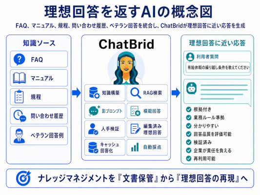 今回の展示で示す“理想回答を返すAI”は、2025年に発表済みのChatBrid機能拡充を土台としています。