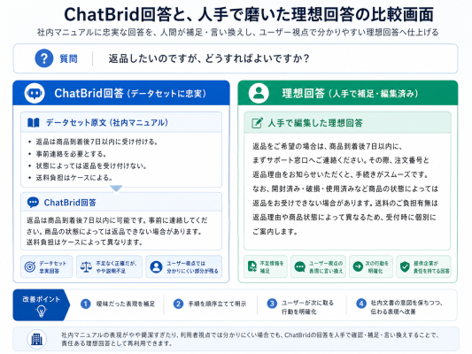 重要なのは、利用者の質問に対して、企業として本来返すべき「正しい回答」「分かりやすい回答」「業務ルールに沿った回答」「顧客に誤解を与えない回答」を、責任もって、安定して再現することです。