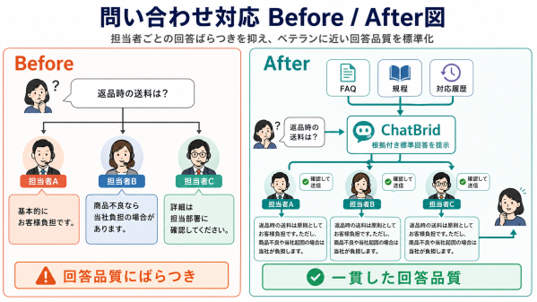 頻出質問や同等意味の質問に対して、確認済みの公式回答を即時に返し、担当者や利用者による回答のばらつきを抑える流れを紹介します。