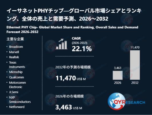 本記事は、QY Research発行のレポート「イーサネットPHYチップ―グローバル市場シェアとランキング、全体の売上と需要予測、2026~2032」に基づき、市場動向および競合分析の概要を解説します。