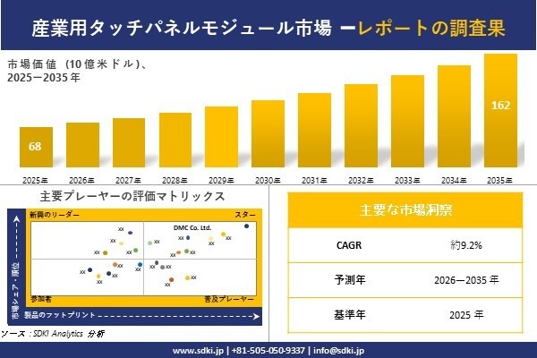 産業用タッチパネルモジュール 市場に関する当社の調査レポートによると、産業用タッチパネルモジュール 市場規模は 2035 年に約 162 億米ドルに達すると予想されています。さらに、2025 年の 産業用タッチパネルモジュール 市場規模は約 68億米ドルとなっています。産業用タッチパネルモジュール に関する市場調査レポートでは、市場は 2026-2035 年の予測期間中に約 9.2% の CAGR で成長するとも述べられています。