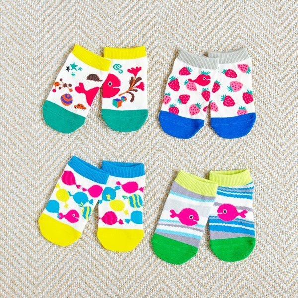 柄は全部で4種類ですが、2種類を1セットにして販売いたします。自分で洋服や靴下を選びたいお年頃の子どもたちにぴったり! 大人の方にももちろん、毎日どの絵柄にしようか楽しく選んでいただきたいアイテムです。