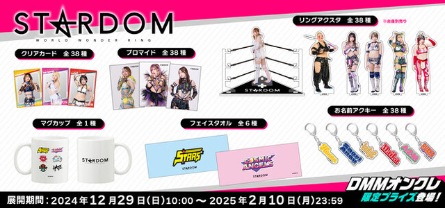 合同会社DMM.com(本社:東京都港区、会長 兼 CEO亀山敬司、https://dmm-corp.com/ 以下DMM )が提供するオンラインクレーンゲームサービス「DMMオンクレ」は、2024年12月29日(日)より、女子プロレス団体「STARDOM」に所属する全38選手のDMMオンクレオリジナルグッズを展開します。