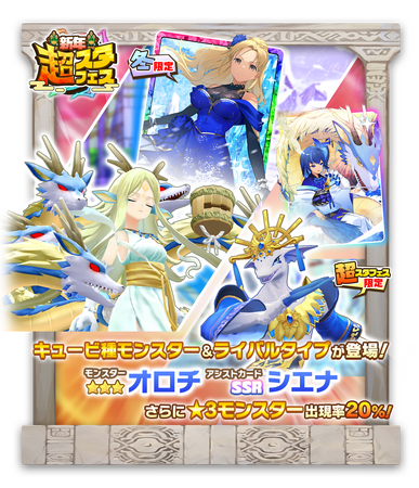 12月31日(火)開催のガチャイベント「新年超スタフェス」では、新モンスター2種、新アシストカード2種が登場します。新★3モンスターにキュービ種「オロチ」とナーガ種「ジョカ」の2種、新アシストカードにかしこさ&回避の新タイプ「ガード」で登場するMR「ミズキ&リュージン」とSSR「【雪原のプリンセス】シエナ」の2種が登場します。ほかにも「マスターハート」、「青のオーラハート」、「青のプシュケー」、「超ごちそうもどき」などの豪華報酬が得られる育成ランキングイベント「モンスターグランプリ」や、新春お正月ログインボーナス、期間中は毎日10連無料の年末年始ガチャなどを開催します。