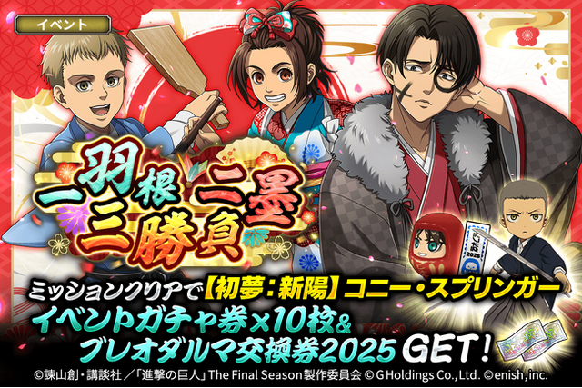 株式会社enish(本社:東京都港区、代表取締役社長:安徳 孝平、以下enish)は、アニメ『進撃の巨人』のスマートフォンゲーム最新作「進撃の巨人Brave Order」にて、2024年12月30日(月)より、一羽根二墨三勝負を開催!また、本日より新登場の【初夢】リヴァイ、【初夢】ファルコ・グライス、【初夢】ガビ・ブラウンがピックアップされた「一羽根二墨三勝負ガチャ」も開催!その他、最新情報はゲーム公式サイト・ゲーム公式X(旧Twitter)アカウントにて随時公開して行きますので、ぜひご覧ください。