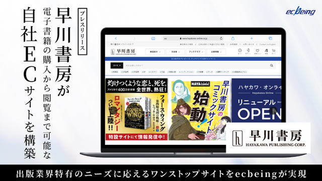 株式会社ecbeing (イーシービーイング 本社:東京都渋谷区、代表取締役社長:林 雅也、以下「弊社」)は、 16年連続※1EC構築プラットフォームシェアNo.1※2のEC構築プラットフォーム「ecbeing」が、株式会社早川書房(本社:東京都千代田区、代表取締役社長:早川 浩、以下「早川書房」)の運営するサイトのプラットフォームに採用され、「ハヤカワ・オンライン」及びコーポ―レートサイトを統合するリニューアルが実施されましたことを発表いたします。