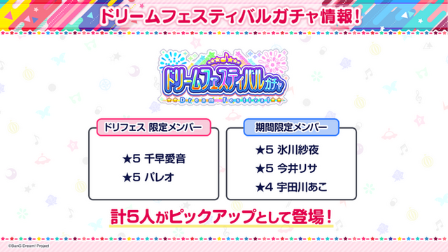 1月31日(金)15時より「ドリームフェスティバルガチャ」の開催が決定いたしました。今回のドリフェス限定メンバーとして★5千早愛音、★5パレオが登場いたします。