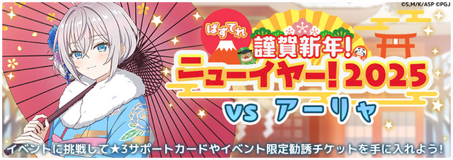 1月24日(金)よりイベント「謹賀新年!ぱずでれニューイヤー!2025 VSアーリャ」を開催します。当イベントでは期間中獲得した累計スコアのランキングにより報酬を受け取ることが可能です。またイベントマップで集めたポイントを交換所で使用して、イベント限定のサポートカードやアイテムが獲得できます。倒すたび強くなるボスに挑戦してよりたくさんのポイントを集め☆3サポートカードや勧誘チケットを手に入れよう!