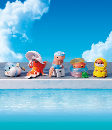 本商品は、「およげないん」に登場するキャラクター9種を、全高約28~46mmサイズにしたカプセルフィギュアマスコットです。一見キャラクターは5種類にみえますが、よく見ると頭やポケット、腰周りにも別のキャラクターがいるため、全部で9種のキャラクターがラインアップされています。