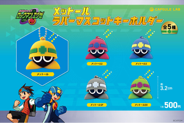 「ロックマンエグゼ」シリーズに登場するウイルス「メットール」が、ラバー素材の立体感あるマスコットとしてカプセルトイ商品に新登場! シリーズおなじみ黄色の「メットール」をはじめ、物語が進むと出会える「2」「3」「SP」「EX」の全5種でご用意いたしました。サイズは約3.2cmと鍵やバッグにつけて一緒におでかけするのにピッタリ。デスクに並べて飾るのもオススメです。360°カワイイ「メットール」をぜひお楽しみください!