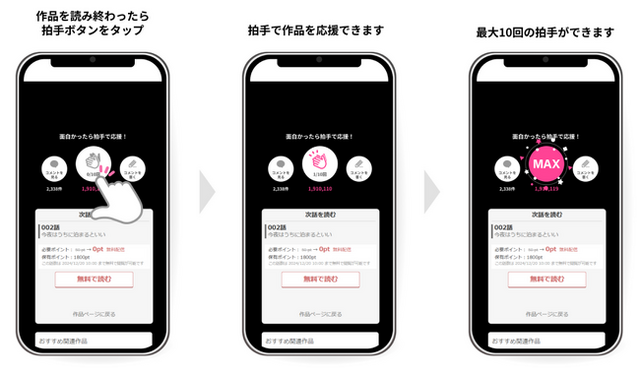 各話の最後に設置された拍手ボタンを使って、作品を読んで感じた「キュンキュンした!」「感動した!」「ワクワクした!」「笑った!」「ほっこりした!」といった多彩な感情を、拍手という形で即座に表現することが可能になります。