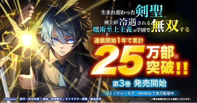 taskey株式会社(本社:東京都新宿区、代表取締役CEO:大石弘務)が発行する、マンガ『生まれ変わった剣聖、剣士が冷遇される魔術至上主義の学園で無双する』(原作:岸本和葉 / 漫画:染野静也 / キャラクター原案:桑島黎音)の累計発行部数が、連載開始約1年で25万部(※)を突破しました。また、本作待望の第3巻目がコミックシーモアにて1月28日(火)に発売開始いたします。