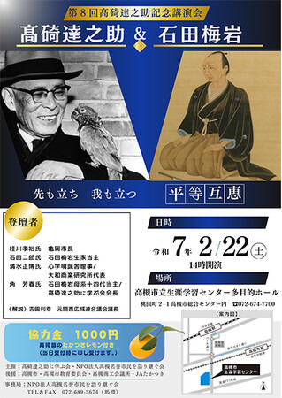 講演会は、名誉市民である高碕達之助氏の功績を語り継いでいこうと、高碕達之助に学ぶ会とNPO法人高槻名誉市民を語り継ぐ会が、テーマを変えながら平成30年から毎年開催。8回目となる今回は、高碕氏の思想に影響を与えた江戸時代中期の思想家で「石田心学」を開いた石田梅岩に注目し、石田梅岩の生誕の地・亀岡市から桂川孝裕市長と江戸時代に大阪に開かれた心学の私塾「心学明誠舎」の清水正博理事を講師に迎え、両者に石田梅岩の「心を磨く材料であれば、どのような教えであろうとも偏見なく活用する」を意味する「一法を捨てず、一法に泥まず、天地に逆らわざるを要とす」という思想をテーマに講演いただきます。高碕達之助に学ぶ会会長の角芳春さんは「高碕氏の顕彰を通じて、志とロマンを有する市少年の育成に寄与することができれば」と話しています。