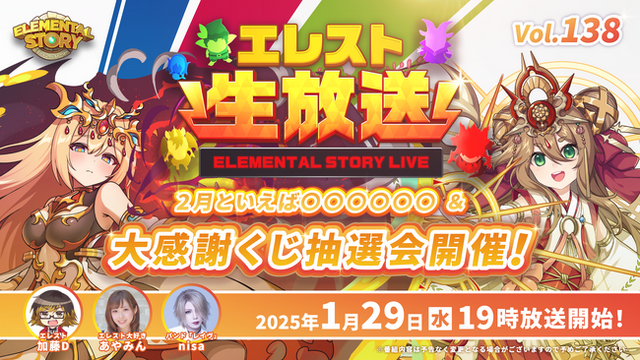 Studio Z株式会社(本社:東京都港区 代表取締役CEO:池幡 賢)が運営しております 共闘対戦 爽快パズル消しゲー『エレメンタルストーリー』では、2025年1月29日(水)19:00より、Studio Z公式エレスト生放送vol.138を配信いたします。