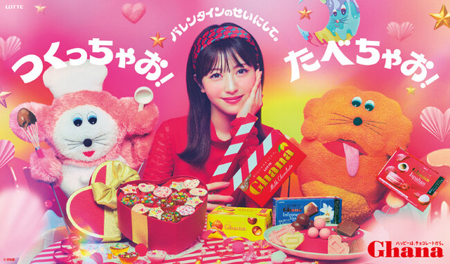 4年目となるガーナの「バレンタインのせいにして。」キャンペーン。バレンタインだからこう過ごさなきゃ、といった固定観念にとらわれず、いっそバレンタインをポジティブな言い訳にして、もっと自由に楽しんでほしい。その思いはそのままに、今年は新キャラクターとして、「ツクチャオ」 、「タベチャオ」を迎え、バレンタインのせいにして劇場「ガーナ・ドッチ」を舞台にバレンタインのせいにした2択の過ごし方を提案します。かわいい世界観と、浜辺さんとツクチャオ、タベチャオとの微笑ましい演技にご注目ください。(ロッテ・ガーナ宣伝担当者)