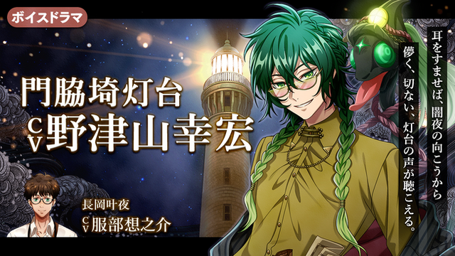 今回お届けする第55弾では、「声優アワード」で歌唱賞を受賞した実力派声優・野津山幸宏さんが演じる門脇埼灯台(静岡県伊東市)の守り人が登場。服部想之介さんが演じるルポライター・長岡叶夜との掛け合いを、1月31日にニコニコ生放送【燈夜会(とうやかい)】で初公開いたします。
