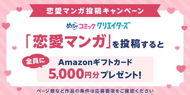 「めちゃコミック クリエイターズ」では「恋愛マンガ」作品の投稿者全員にAmazonギフトカード5,000円分を贈呈するキャンペーンを実施します。ぜひ奮ってご参加ください。
