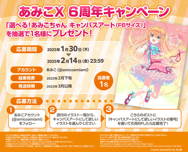 大網株式会社(本社・東京都文京区)は、自社が運営するホビーショップ「あみあみ」看板娘『あみこ』のX(旧Twitter)アカウント6周年を記念して、「選べる!あみこちゃん キャンバスアート(F6サイズ)」をプレゼントするキャンペーンをX(旧Twitter)で開催中です。