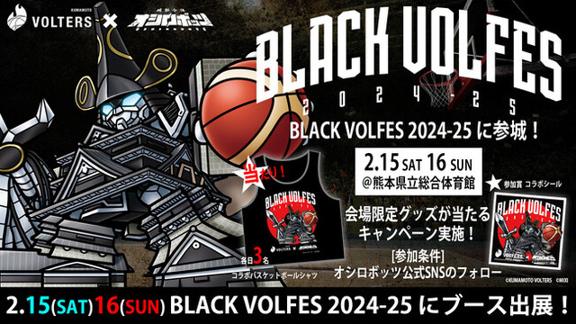 株式会社MIXI(東京都渋谷区、代表取締役社長 上級執行役員 CEO:木村 弘毅)は、2025年2月15日(土)~16日(日)に熊本県立総合体育館で開催される「BLACK VOLFES 2024-25」にMIXI_ANIMEオリジナルコンテンツ『城郭合体オシロボッツ』を出展し、物販と会場限定グッズが当たるキャンペーンを実施します。
